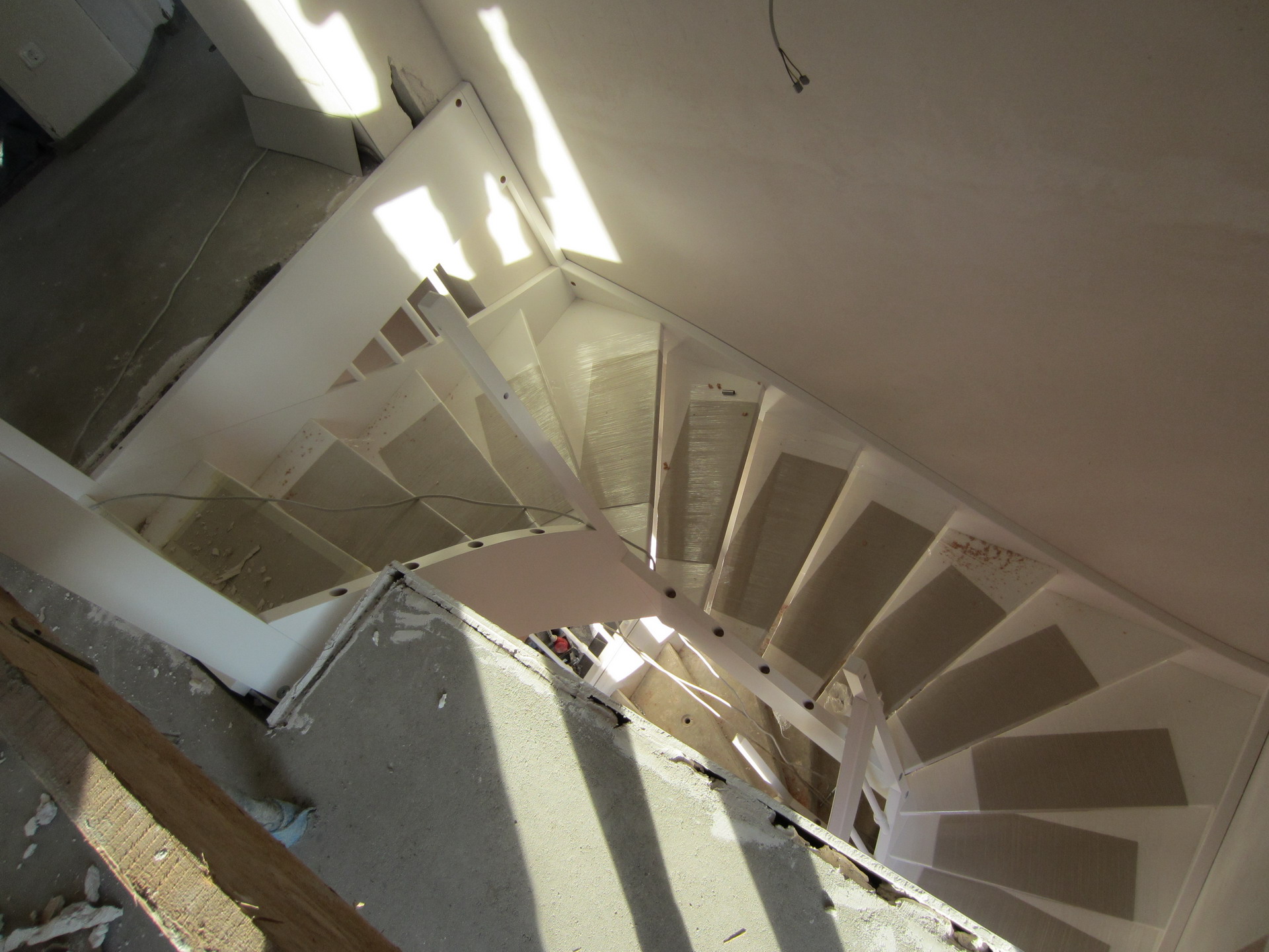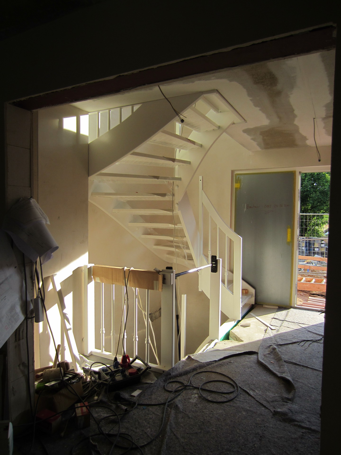 …die 600 Kilo schweben ohne irgendwelche Schwierigkeiten in ihre endgültige Position, gebettet auf Magerbeton-Estrich. Einzig die grünen Schlupp sind offizielle Opfer der Aktion und werden nach Setzen der Stufe zur Entfernung zerschnitten und Richtung Einfahrt herausgezogen.