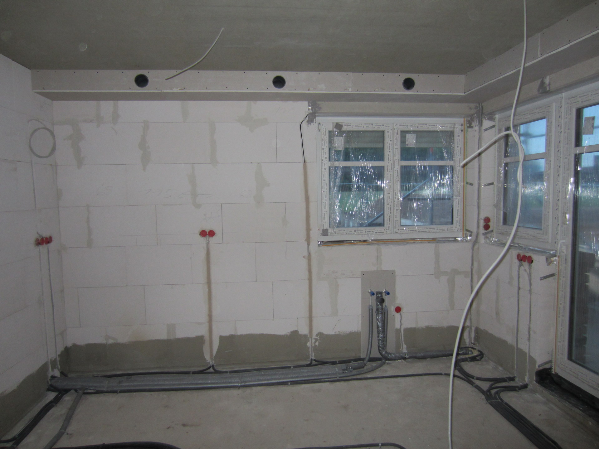 …auf der EG-Decke steht längst das Material für die OG-Wände, die Dach- und Drempel-Innenverkleidung und der Schornstein ab hier