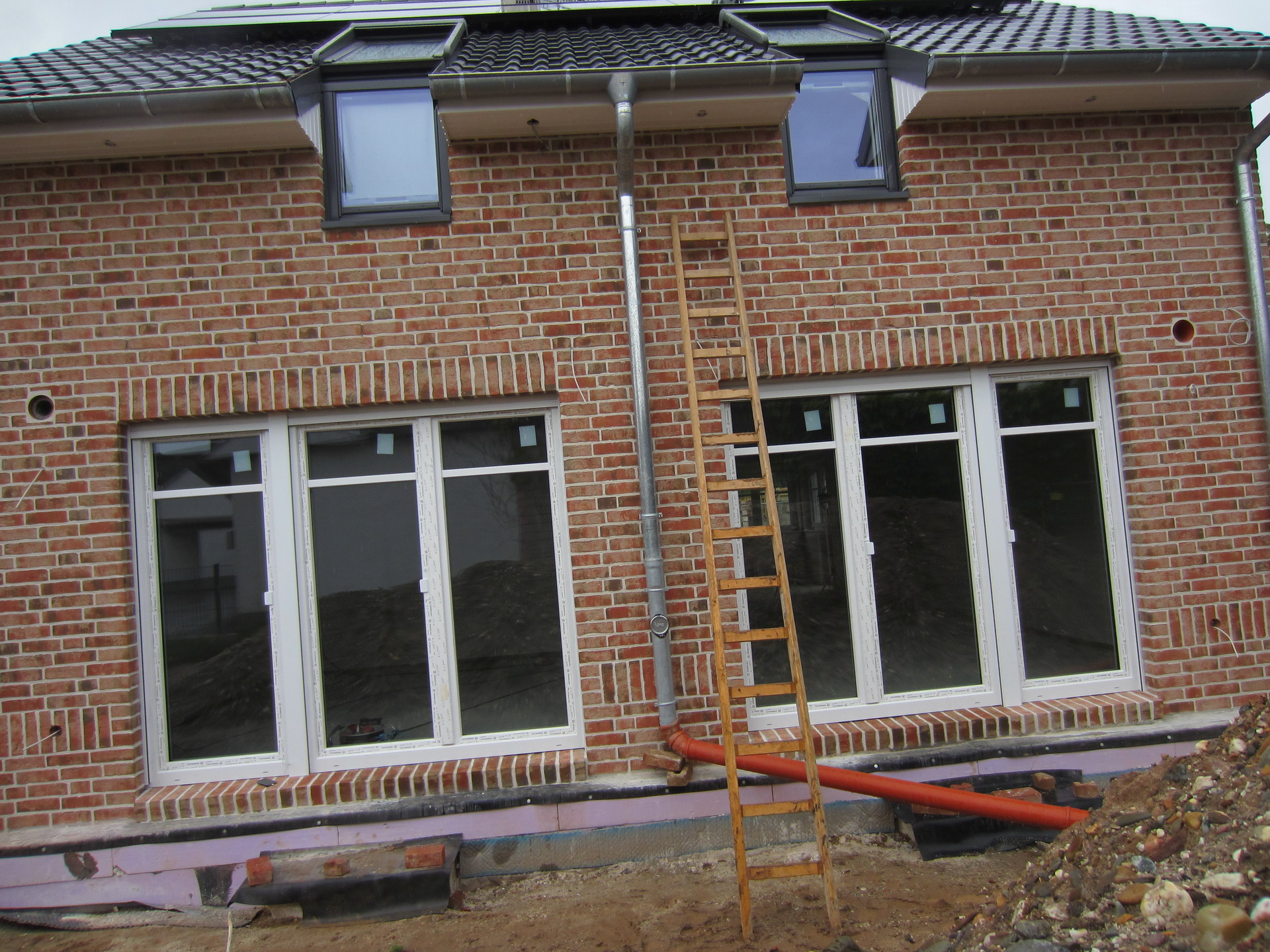 …vorne fehlt noch der Sturz, hier wurde noch geschalt und beigespachtelt, um die Winkelriemchen flächiger aufnehmen zu können (Sturz ab Werk abgeschrägt)