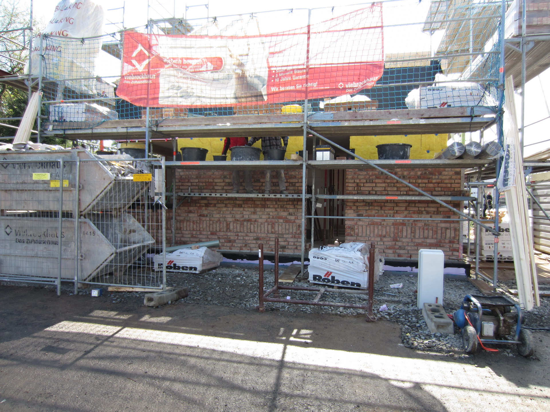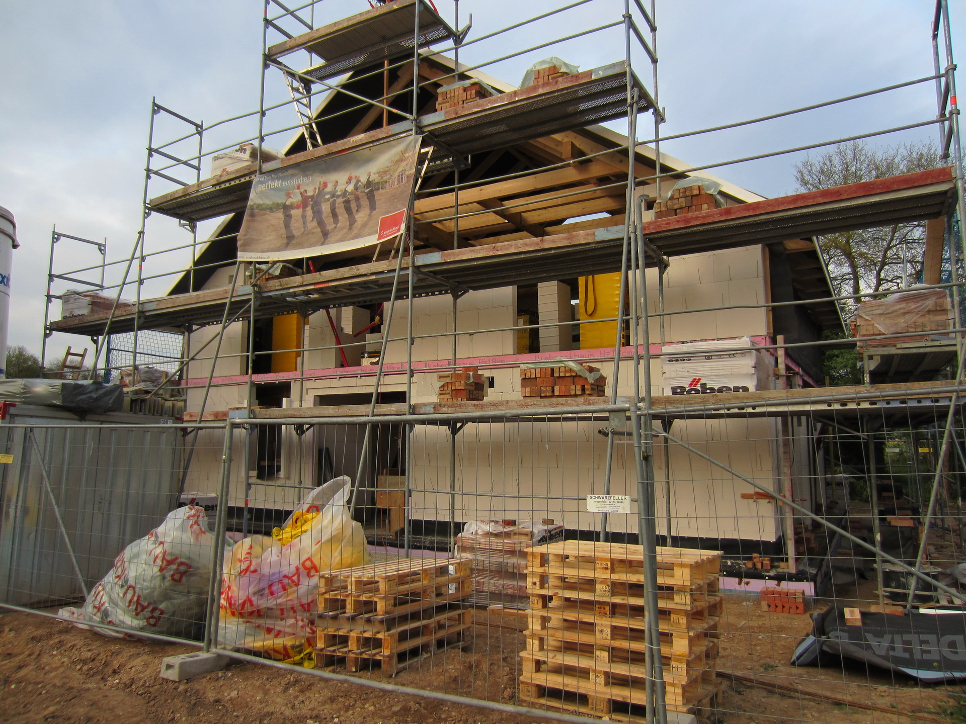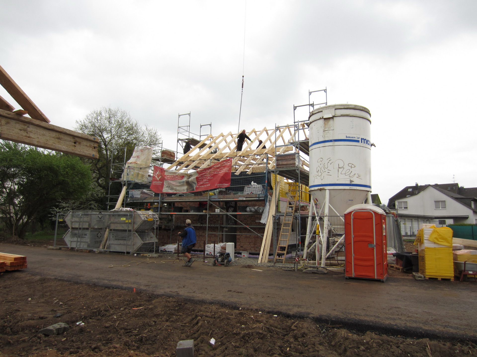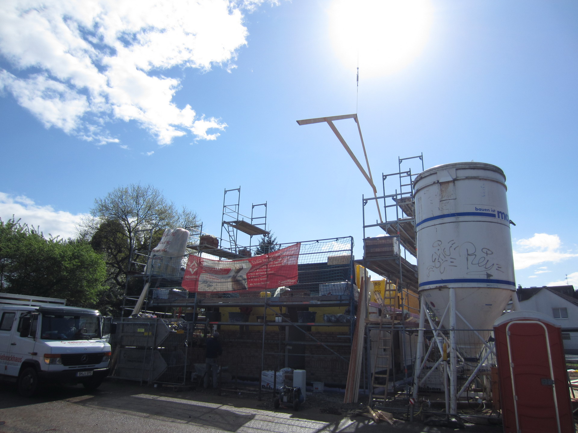 …der April beschert uns einen weiteren Schauer mit Hageleinlage – die Bauherren laune sinkt dramatisch, man verschanzt sich mit Kölsch im Rohbau gegenüber