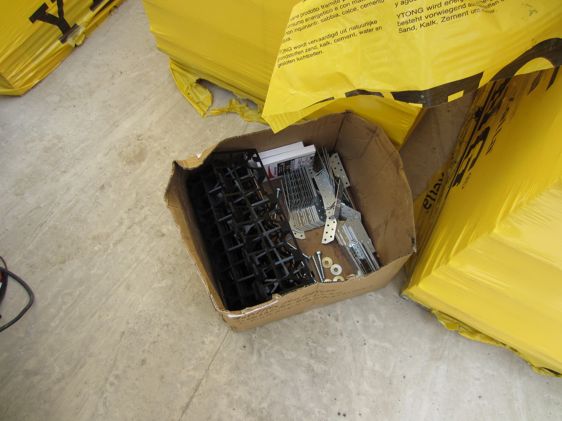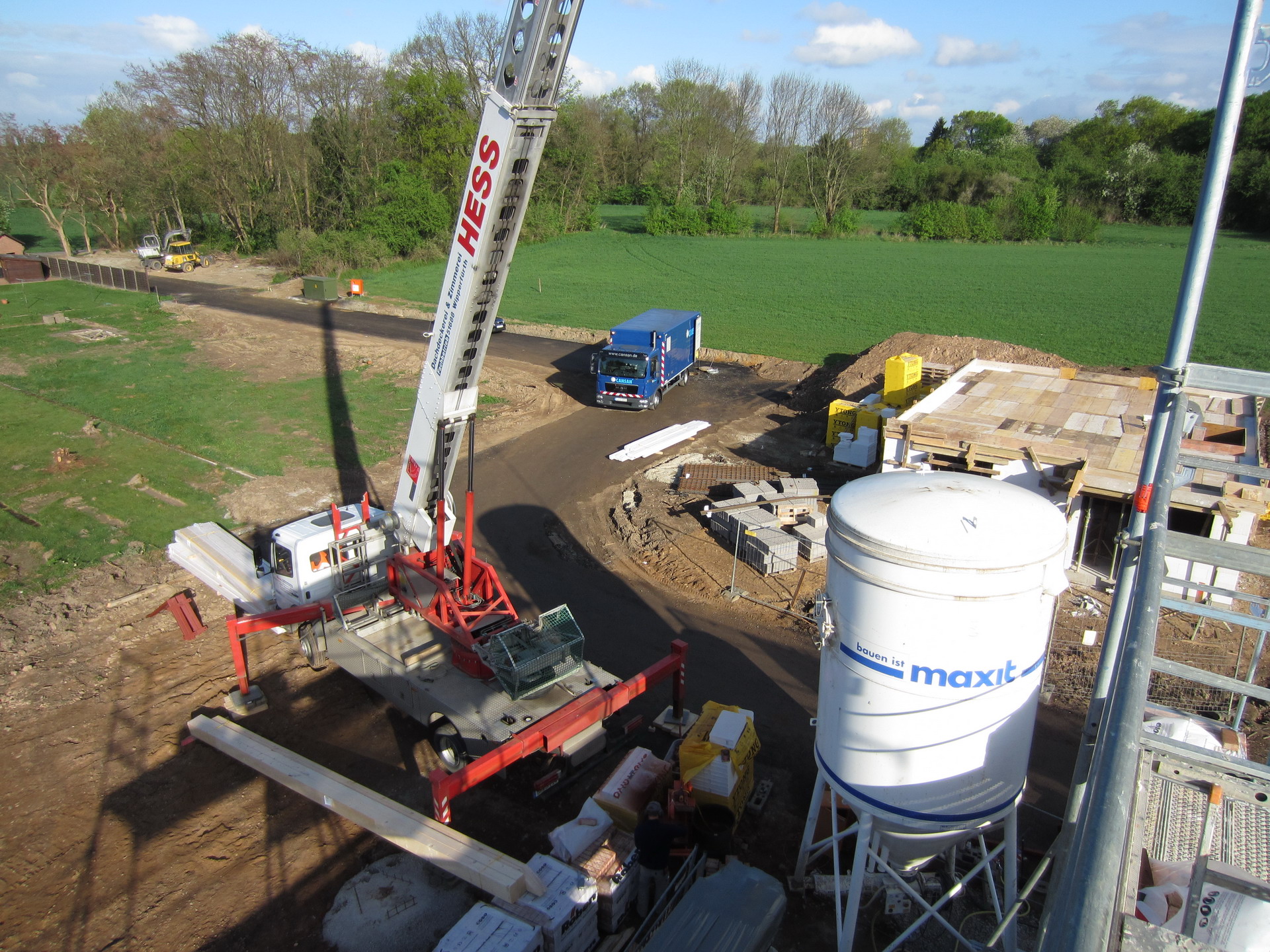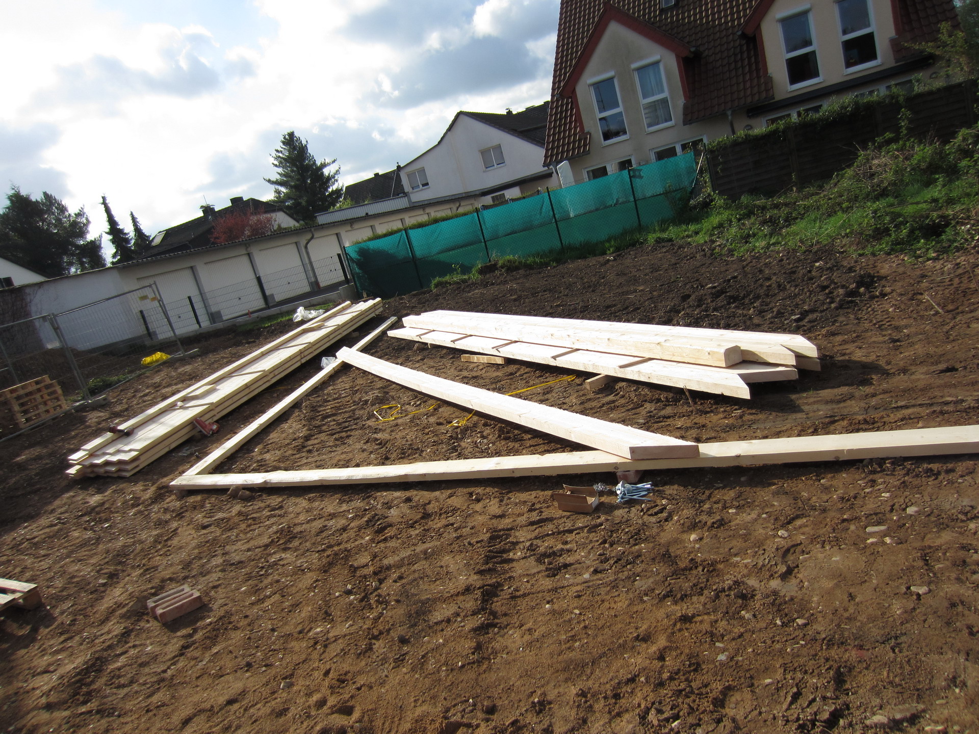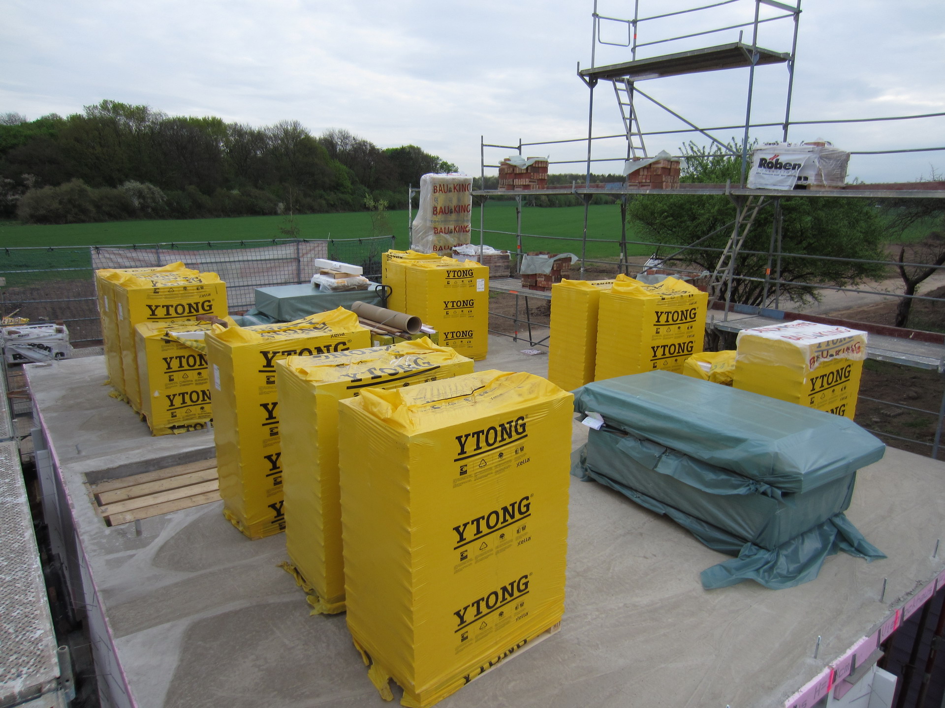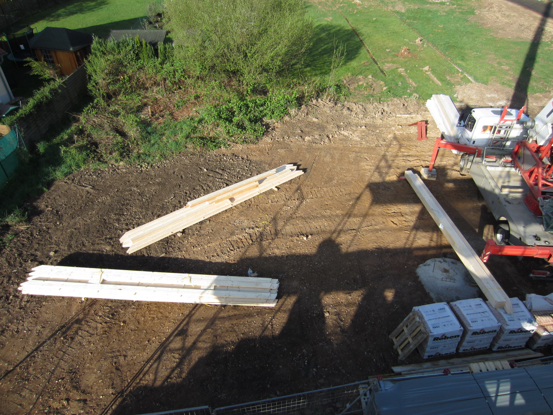 …auf der EG-Decke steht längst das Material für die OG-Wände, die Dach- und Drempel-Innenverkleidung und der Schornstein ab hier