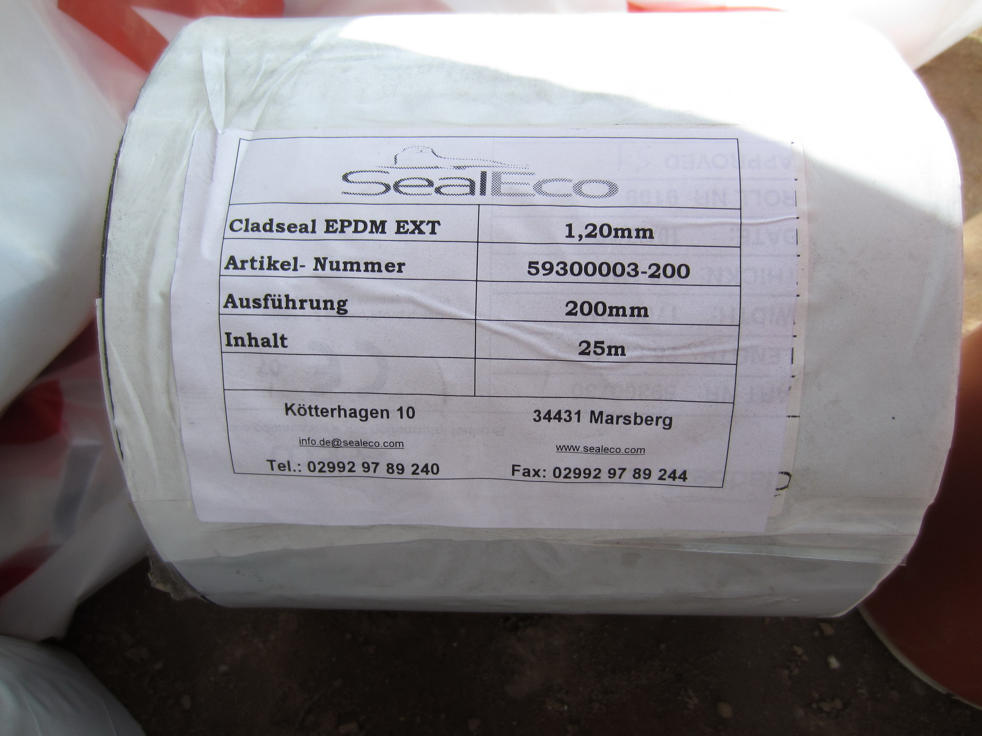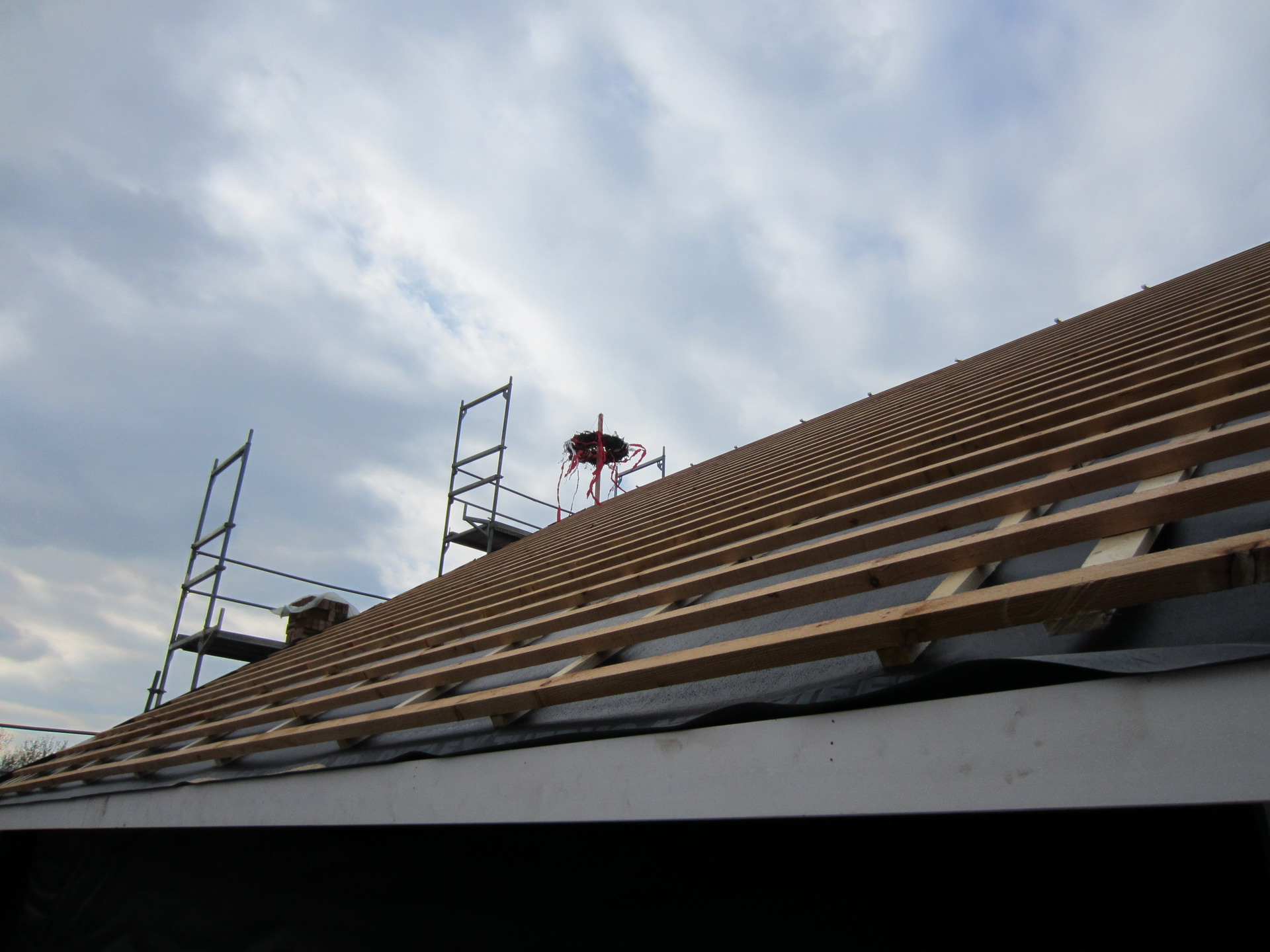 …auf dem Baucontainer lagern gut verpackt die grundierten Nut- und Federbretter für Traufe und Ortgang