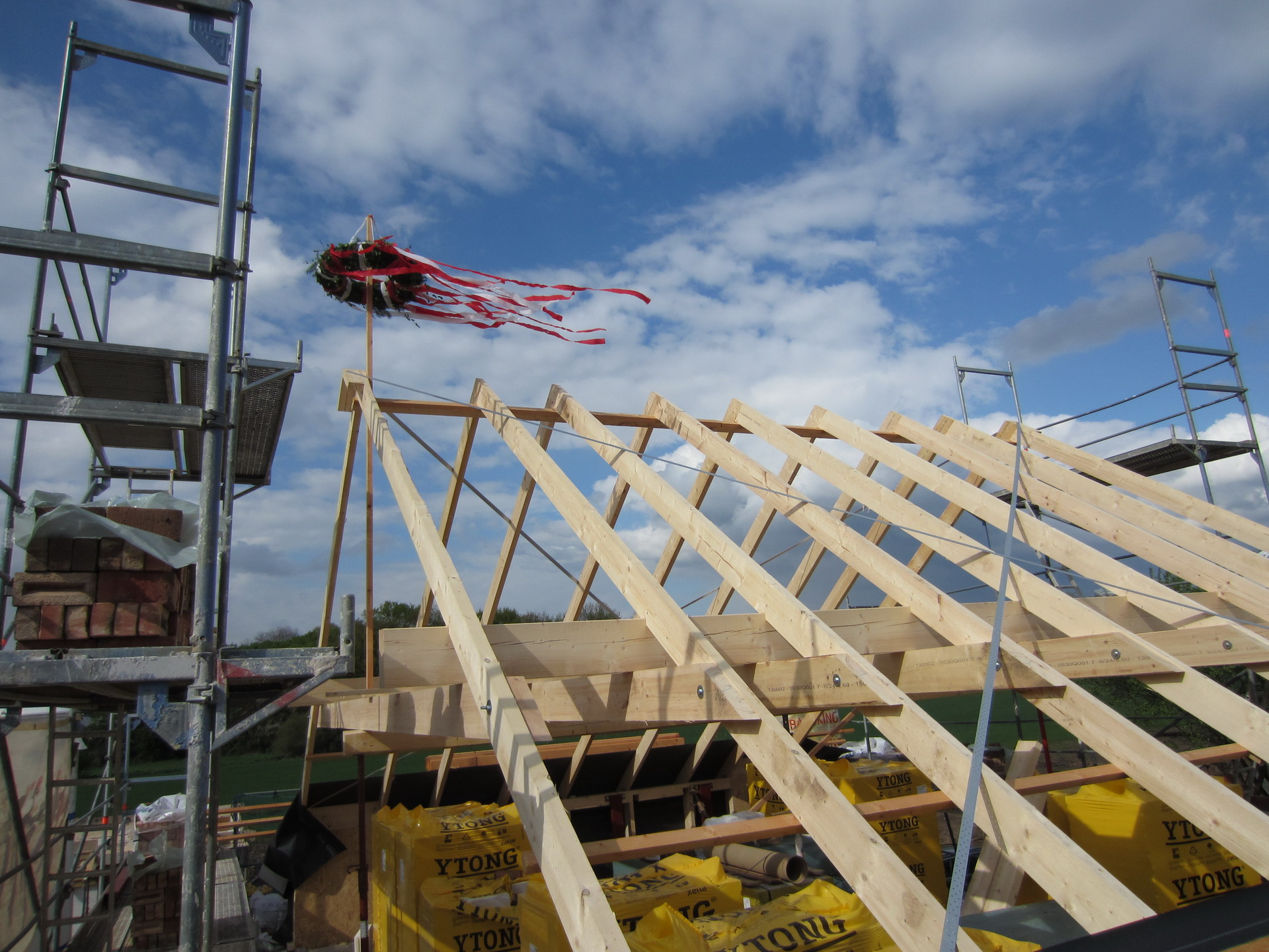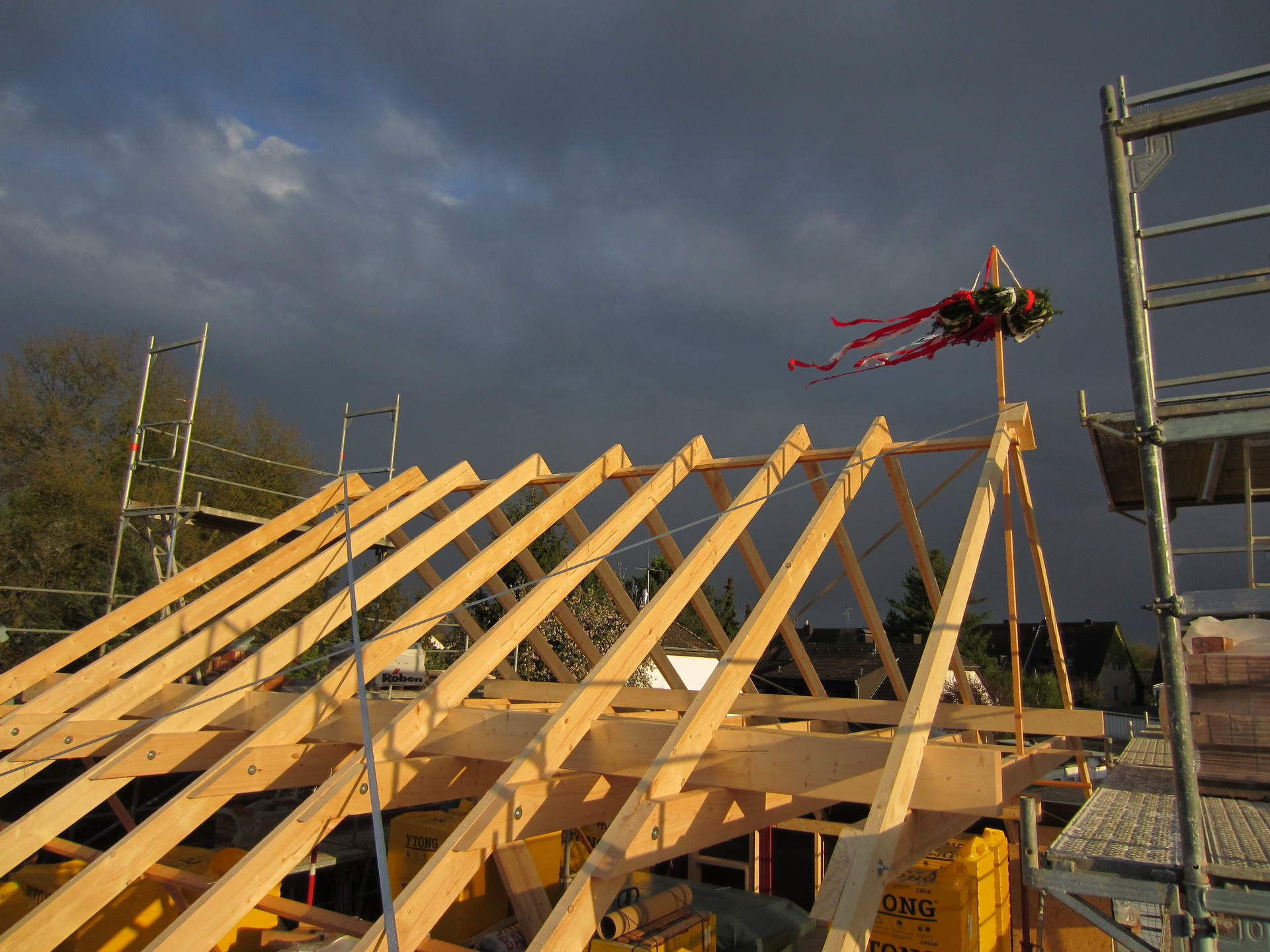 …der Zimmermann hat gesprochen, einen Korn gehoben und das Glas zerdeppert – unser kölsche Kranz fliegt im Wind 😉 (Es kommen die Maurer, die Zimmermänner, der Viebrockhaus-West Chef, unsere Mimi und engste Freunde zur Bio’s-Bohnensuppe und auf ein Kölsch – vielen Dank an Alle – schön war’s !!!)